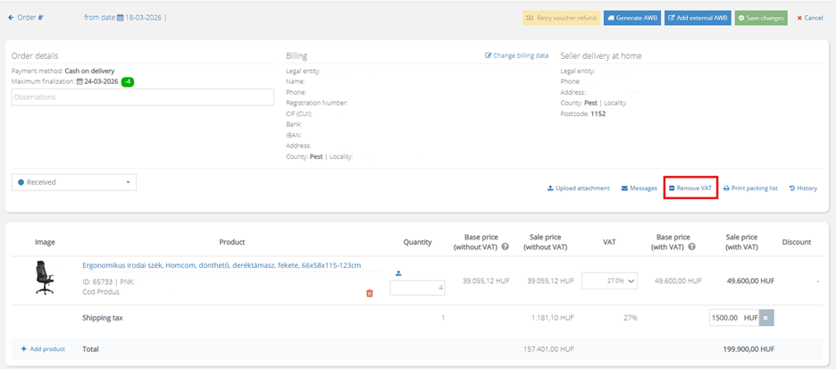 - Remove VAT from the order by accessing the Remove VAT button.