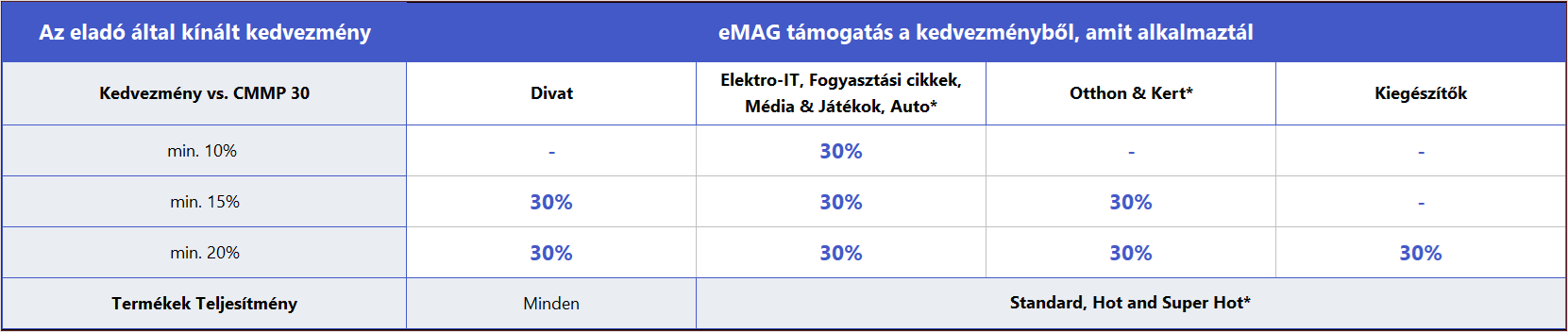 eMAG támogatás: 30% támogatás az általad kínált árengedmény értékéből az Okos Ajánlatok különleges kiadás, valamint a Smart Deals jelvény megszerzéséhez.