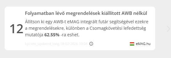 Megjeleníti azokat a véglegesített rendeléseket, amelyekhez nem állítottak ki AWB-t az eMAG Marketplace platformon keresztül. A widget egy előrejelzést is mutat a Csomagkövetési lefedettség mutatóra vonatkozóan. Amikor rákattintasz a widgetre, szűri az összes véglegesített rendelést AWB nélkül az aktuális hónap első napjától a mai napig.