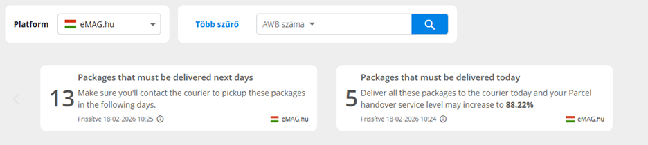 Összegyűjt minden folyamatban lévő rendelést, amelyekhez nem állítottak ki AWB-t az eMAG Marketplace platformon keresztül. Tartalmaz egy előrejelzést a Csomagkövetési lefedettség mutatóra vonatkozóan, és aktiválja az összes beérkezett és előkészített rendelést az aktuális hónap elejétől a mai napig.