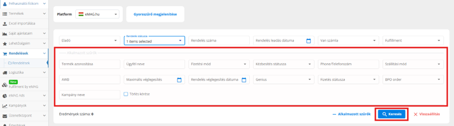 Használhatod a Gyors keresés gombot is, amely az oldal tetején található, és lehetővé teszi, hogy több szűrőt egyszerre alkalmazz. Ez lehetővé teszi, hogy rendeléseket keress a következők kiválasztásával: