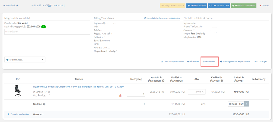 - Távolítsd el az ÁFÁ-t a rendelésből Remove VAT gomb megnyomásával.