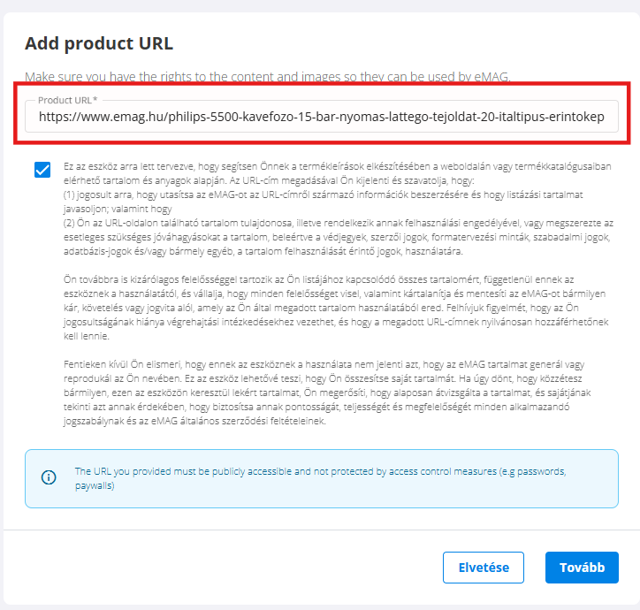 - Megjelenik majd az eMAG Marketplace HU-ban már listázott termék, amely megfelel az általad beszúrt linknek.