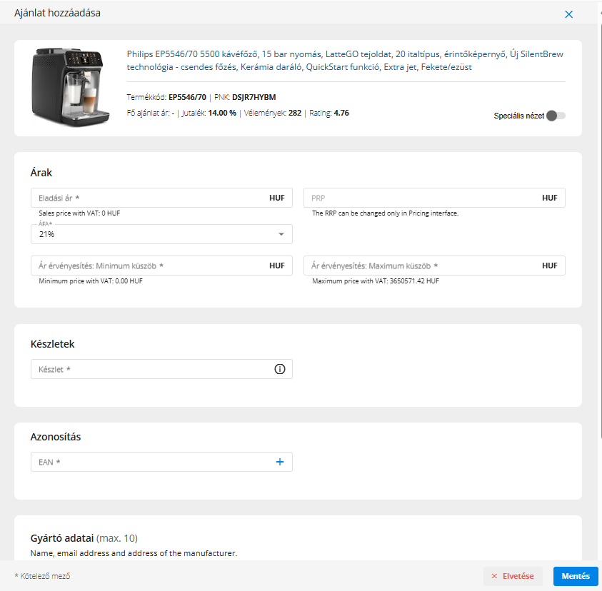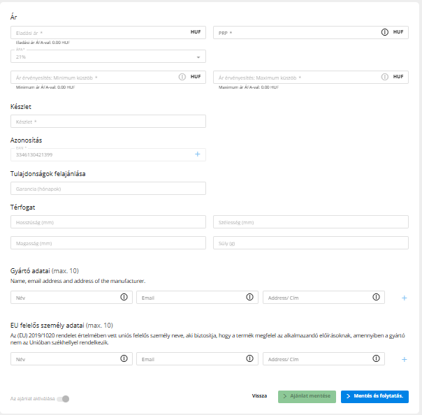 - Töltsd ki az ár, készlet és GPSR részleteket(gyártó és EU felelős személy)! Kattints a Mentés gombra a társítás véglegesítéséhez!