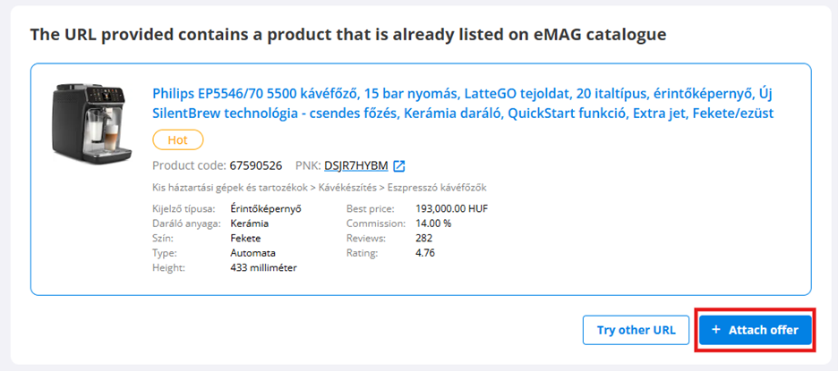 - Megjelenik az eMAG-ban már listázott termék, amely megegyezik a linkeddel. Kattints az Attach offer gombra.