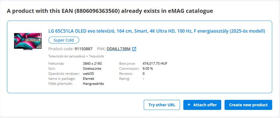 - Ha egy azonos termék már létezik az eMAG Marketplace HU platformon (ugyanaz az EAN, név, márka és kategória), a rendszer automatikusan javasolni fogja az ajánlatod ahhoz történő társítását.