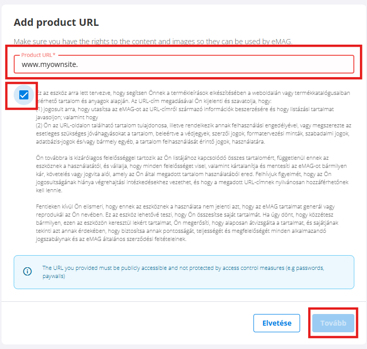 - Az eszköz használatával vállalod a felelősséget a tartalom pontosságáért és az eMAG törvényeinek és feltételeinek való megfelelésért.